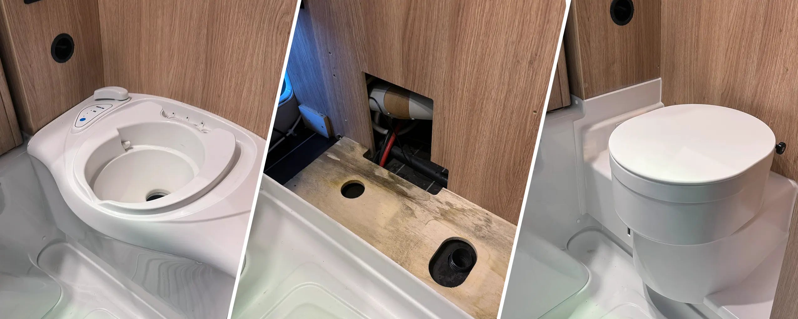 Die Thetford sitzt hier integriert an einer Duschtasse. Die Trockentrenntoilette passt nach umfangreichen Anpassungen gut. Der Ausbau der Bank-Toilette ist anspruchsvoll. die teilweise vorhandene Bodenentlüftung kann verwendet werden. Die vollständige Abdichtung mit Sikaflex ist empfehlenswert. Der Einbau in einer Fachwerkstatt sollte in Betracht gezogen werden